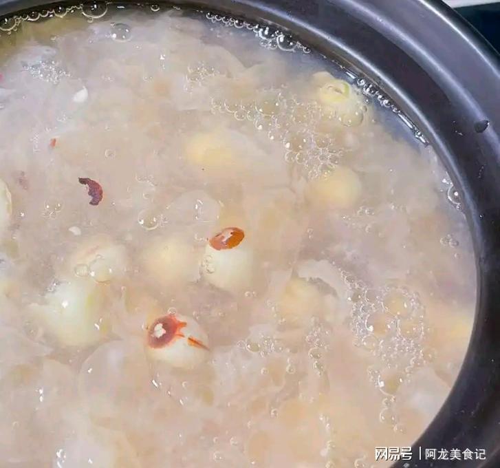 第四步:将泡胀的银耳、莲子全部都放入锅中,然后开大火,将水煮沸后改小火,继续炖20分钟左右,直到汤比较黏稠时,就需要立即关火,接着将它们焖30分钟,就能使银耳出胶。